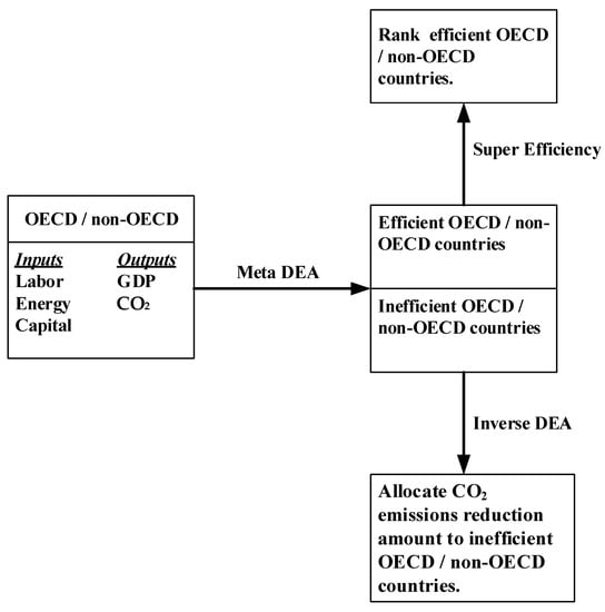To fill out the research gap, this study proposes a new meta-inverse DEA method to illustrate how can countries achieve net-zero emissions targets, and estimate the potential carbon emission reductions which can be achieved by developed and developing countries without changing their current eco-efficiency levels. Thus, this study not only extends the application to inverse DEA but also conforms to the consensus on international climate negotiations. There are three main research questions, and different approaches are employed to address each research question. First, which countries are benchmarks in terms of eco-efficiency? This study employed meta-frontier DEA to identify which countries are eco-efficient in OECD and non-OECD groups respectively. Second, how to rank the eco-efficient countries specifically focused on carbon performance? The super-efficiency was adopted for ranking. Third, how to allocate the emissions reductions target to inefficient OECD and non-OECD member countries to achieve the goal of limiting global warming to 1.5 °C? The new-meta inverse DEA is used to allocate the emissions target to OECD and non-OECD members respectively through resource planning with unchanged eco-efficiency. The research framework is illustrated in Figure 1.