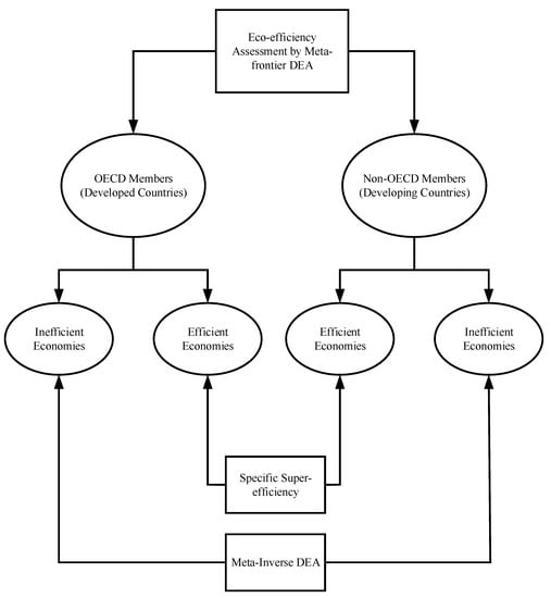 This study adopts a three-stage approach, and different methodologies are applied in different stages based on specific purposes. A research flow chart is presented in Figure 2. In the first stage, a meta-frontier DEA method is adopted to assess and compare the eco-efficiency of developed and developing countries. In the second stage, the specific super-efficiency method is adopted to rank the efficient countries specifically focused on carbon performance. In the third stage, carbon dioxide emissions reduction targets are proposed for the developed and developing countries separately. Then, a new meta-inverse DEA method is used to allocate the emissions reduction target to the inefficient countries in each of the specific groups. In this way, we can find the optimal CO2 reduction amount for the inefficient countries with unchanged eco-efficiency levels.