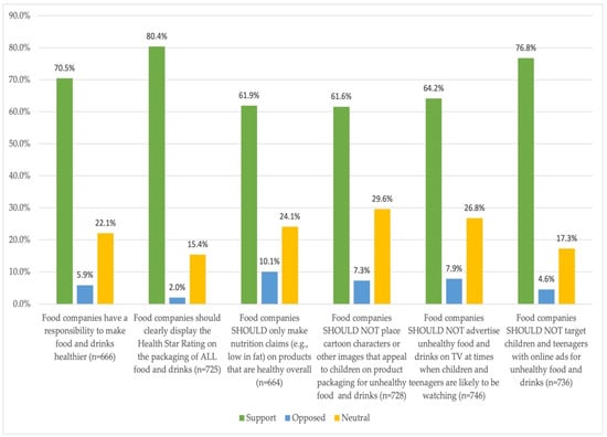 In the absence of government regulation, pressure on food companies from external stakeholders such as the general public and investors can lead to increased implementation of nutrition-related actions (e.g., via corporate sustainability strategies) [,,]. An understanding of the extent of public support for food company action is an important advocacy tool to inform strategies to influence food industry efforts to improve the healthiness of Australian food environments. Public expectations of food companies can also guide government policy development [].