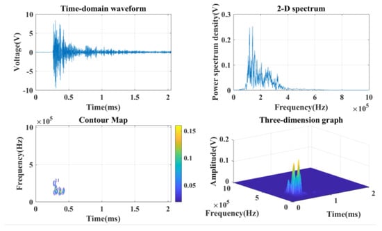 Stress with time for a 30-degree bedding angle under the saturated state: (a) the actual stress path; and (c) the corresponding acoustic emission energy curve. Images (b,d) are the waveform characteristics of key points.