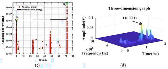 Stress with time for the 45 bedding angle under natural state: (a) the actual stress path; and (c) the corresponding acoustic emission energy curve. Images (b,d) are the waveform characteristics of key points.