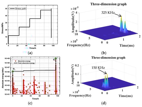 Stress with time for a 45-degree bedding angle under the saturated state: (a) the actual stress path; and (c) the corresponding acoustic emission energy curve. Images (b,d) are the waveform characteristics of key points.