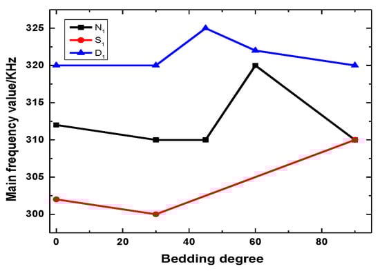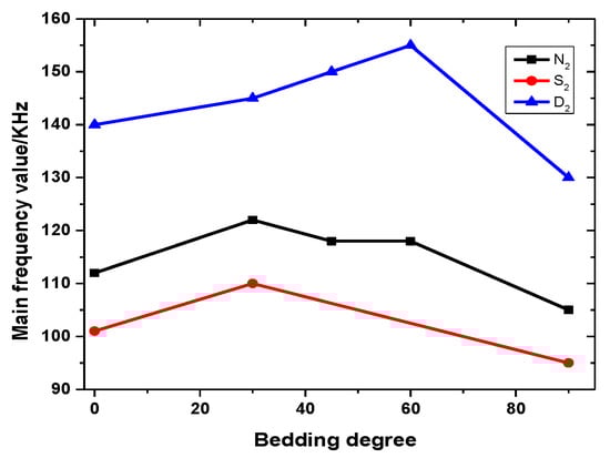 Curves of final main frequency value with different bedding angles under different water content levels.