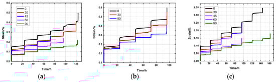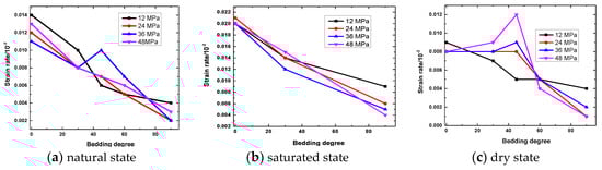 Strain with time for different bedding angles under different states: (a) natural state; (b) saturated state; and (c) dry state.