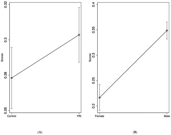 The results also demonstrated that the gender of peers does not moderate the association between the index participants’ study arm (e.g., YRI or control) and the YRI skills and knowledge scores of peers. No personal network characteristics were significantly associated with YRI skills and knowledge. Figure 1 displays the linear prediction of skills and knowledge scores across gender with 95% CI. Figure 1A demonstrates that the skills and knowledge of YRI participants’ peers are significantly higher than control participants’ peers. Figure 1B shows that the skills and knowledge of female peers is significantly lower than that of male peers.