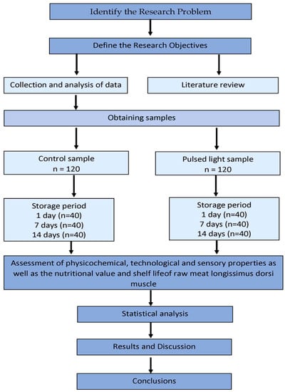 The research material consisted of samples of the longissimus dorsi muscle—(m. longissimus dorsi) obtained from pork half-carcasses from individual farmers associated in producer groups with contracts with a meat plant in the region of southeastern Poland. The fattening pigs were kept under the same environmental conditions and fed the same complete feeding mixtures. The animals had unlimited access to water. The study included meat from 40 fattening pigs (hybrids of the ♀ Polish Landrace × ♂ Duroc breeds), of which 50% were gilts and 50% were hogs. The carcass weight of slaughtered fatteners ranged from 110 to 120 kg. Animals after transport were kept in livestock stores for about 5 h. Slaughtering was carried out in accordance with the methodology of the meat industry. Before slaughter, the animals were subjected to electrical stunning. After 24 h of cold storage (+3 °C ± 0.5 °C), the longissimus dorsi muscle from the segment between the 4th and 5th thoracic vertebrae and the last lumbar and first sacral vertebrae was trimmed from the right half-carcasses. Each muscle was divided into six pieces across the muscle fibers. The size of the pieces was 50 × 50 × 50, three of which were control samples, and the rest were exposed to pulsed light (exposure to a pulsed light beam at 400 Hz for a period of 60 s with an energy dose of 600 mW and wavelengths of 660 and 405 nm). Both sides were exposed to PL. The distance between the light source and surface was 20 cm, and the area-related energy input of the PL was 6 J/cm2 within 1 min, which corresponds to the power density of 100 mW/cm2. Detailed laboratory tests of the meat were conducted 1, 7, and 10 days after slaughter. The meat was cold stored at +3 °C ± 0.5 °C. Starting from the 8th day (standard raw meat stored cold, without packaging, has a shelf life of about 7 days after slaughter), inspection tests were conducted daily to assess the freshness of the meat. Meat odor and surface appearance were evaluated. If a foul (ammoniacal) odor and/or slimy appearance on the surface were found on meat samples after fixation treatments, the meat was withdrawn from further cold storage and testing. After each period of cold storage, the following was performed on the control samples and after the application of pulsed light: