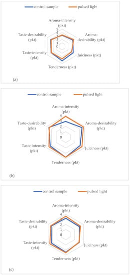 Sensory analysis of the longissimus dorsi muscle after cold storage and pulsed light application (a) 1 day cold storage, (b) 7 days cold storage, (c) 10 days cold storage.