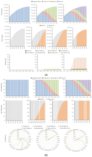 Deployment of AVs, IRs, and V2V. (a) Vehicle stocks of AVs and V2V; road mileage of IRs in China from 2015 to 2050; (b) Proportion of AVs and V2V in the vehicle stocks; the proportion of IRs in different road types from 2015 to 2050.