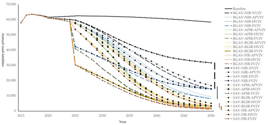 The speed of decline is determined by the equipment rate of V2V. If IR coverage is high and V2V is only equipped to partially and fully AVs, road fatalities will decline slowly from 2025, and the high decline will not be realized until the proportion of partially and fully AVs is high enough. The fatalities are estimated to be 57,737, 44,720, 16,760, and 2943 in 2025, 2030, 2040, and 2050 in scenario RGAV-FIR-APV2V, which is similar to the declining trend of RGAV-RGIR-APV2V and SAV-FIR-APV2V. Compared to scenarios with APV2V, scenarios with HV2V and FV2V have a benefit space in the figure brought by a faster decline, although the estimated annual death toll in 2050 is close. V2V should be equipped as early as possible, with as many vehicle types as possible to reduce the fatalities related to road crashes more quickly.