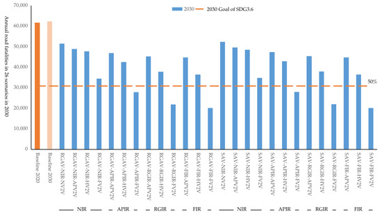 Corresponding ambitious SDG 3.6 goals can only be achieved through the synergetic development of autonomous vehicles, intelligent roads, and V2V. In 2030, 6 out of 26 synergetic scenarios meet the target for reducing injuries by 50% compared to 2020, including RGAV-APIR-FV2V, RGAV-RGIR-FV2V, RGAV-FIR-FV2V, SAV-APIR-FV2V, SAV-RGIR-FV2V, and SAV-FIR-FV2V, as shown in Figure 4. Deploying intelligent roads as planned (APIR) and fully equipped V2V (FV2V) are required for achieving the SDG 3.6 goal. There will be 27,793, 21,917, 20,143, 27,969, 21972, and 20,164 road traffic fatalities in the six scenarios in 2030, lower than 50% of the fatalities in 2020. In addition, there are 6 out of 26 scenarios that are close to achieving the goal in 2030, namely RGAV-NIR-FV2V, RGAV-RGIR-HV2V, RGAV-FIR-HV2V, SAV-NIR-FV2V, SAV-RGIR-HV2V, SAV-FIR-H2V. The estimated road fatalities in 2030 are 34,480, 37,834, 36,424, 34,774, 37,948, and 36,464, respectively. In general, to achieve the ambitious goal of halving traffic fatalities by 2030, it is necessary for all vehicles to be equipped with V2V, otherwise the possibility of achieving the 2030 goal will be lost. On the basis of FV2V, IR should at least cover the road type selected in the APIR scenario to achieve SDG target 3.6. FIR is unnecessary to achieve the 2030 goal because FIR needs to cover 4.67 times the mileage of RGIR and APIR, which will waste a lot of economic resources.