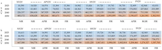 The two scenarios with the largest cumulative reductions in fatalities are RGAV-FIR-FV2V and SAV-FIR-FV2V, which can reduce 1308 thousand and 1303 thousand road fatalities from 2015 to 2050. The two scenarios with the lowest cumulative fatalities avoided are RGAV-NIR-NV2V and SAV-NIR-NV2V: only 668 thousand and 485 thousand fatalities could be reduced cumulatively. The greater the investment in IR and V2V, the more cumulative road fatalities could be reduced. Comparing the results in Figure 5a,b, it can be observed that the cumulative fatalities reduced are similar to synergetic scenarios with the same V2V and IR (the same location in a and b). Especially in the synergetic scenarios with more positive deployment in IR and V2V, the difference in the cumulative reductions in fatalities brought by RGAV and SAV is smaller. RGAV-FIR-FV2V is estimated to only reduce 4795 more fatalities than SAV-FIR-FV2V cumulatively in 2015–2050. This reveals that when choosing to invest more in the development of IR and V2V, it is not necessary to invest too much in AV to realize the RGAV scenario, because the additional benefits brought by the RGAV in synergetic scenarios are not so high. However, when only AV is selected for development, without IR and V2V, it is important to attempt to realize RGAV. The 2015–2050 cumulative fatalities reduction in RGAV-NIR-NV2V is 182 thousand more than that in the SAV-NIR-NV2V scenario. Increasing V2V investment while reducing IR investment is a good way to achieve similar safety benefits. The 2015–2050 cumulative fatalities reduced by SAV-FIR-APV2V are 915 thousand, while 2015–2050 cumulative fatalities reduced by SAV-APIR-HV2V and SAV-NIR-FV2V are estimated to reduce 1004 thousand and 936 thousand fatalities.