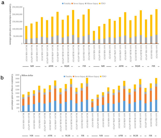 RGAV-FIR-FV2V would have the largest safety benefits, resulting in 1.3 million fewer fatalities, 5.3 million fewer severe injuries, 54.9 million fewer minor injuries, 176.0 million fewer PDO collisions, and reducing crash-related costs by USD 1853 billion cumulatively in 2015–2050 in China. SAV-FIR-FV2V would have the second largest safety benefits, resulting in 1.3 million fewer fatalities, 5.3 million fewer severe injuries, 54.8 million fewer minor injuries, 175.3 million fewer PDO collisions, and reducing crash-related costs by USD 1847 billion cumulatively in 2015–2050 in China.