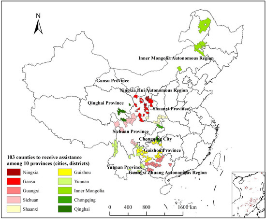 According to the list of key counties to receive assistance announced by the Chinese government in August 2021, the National Administration for Rural Revitalization expanded poverty eradication efforts focused on remote or high-altitude counties in the western region of China because the natural environment is relatively harsh and the economic base and social institutions are not well-developed. They entered the next phase of this effort by evaluating farming communities in the 10 western provinces (cities and districts) according to the follow indices: per capita GDP, per capita general public budget revenue, and per capita disposable income. Additionally, they integrated factors such as the timing of poverty alleviation and the risk of returning to poverty. This evaluation allowed 160 key counties to be identified as candidates to receive assistance in pursuing rural revitalization, which is distributed in Inner Mongolia Autonomous Region, Guangxi Zhuang Autonomous Region, Chongqing City, Sichuan Province, Guizhou Province, Yunnan Province, Shaanxi Province, Gansu Province, Qinghai Province, and Ningxia Hui Autonomous Region. A map of the spatial distribution of the 103 key counties is shown in Figure 1. See Appendix A for the specific list.