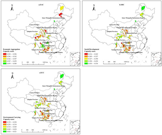 This study measured the following as secondary indices of CSDC: economic aggregation capacity (EAC), social development capacity (SDC), and environmental carrying capacity (ECC). Each of these dimensions had their calculated scores split into five levels: low, medium-low, medium, medium-high, and high, with reference to the Natural Breaks Classification method. Additionally, visualization was carried out via ArcGIS 10.8 (Figure 3).