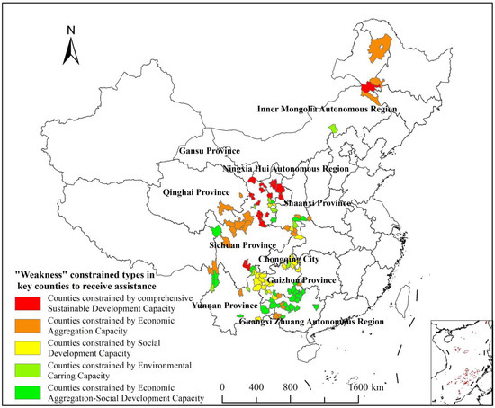 This paper determined that EAC was an important index for measuring CSDC because a total of 72 (69.9%) key counties to receive assistance in categories I, II, and V had EAC scores that restrict the development of the county, which in turn limits improvement in other dimensions of development capacity. This bottleneck could result in a multi-factor “weakness” that constrains their overall CSDC. In this way, our model predicted the reality of these counties: counties in categories II, III, and IV have single-factor constraints or an obvious “weakness” that constrains their ability to improve their overall sustainable development, despite having a good foundation for development in other dimensions.