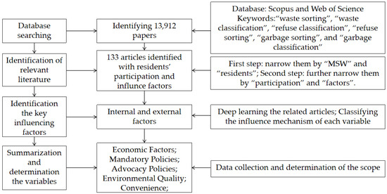 Firstly, data concerning waste classification and resident participation were collected from the literature. Additional information from the Scopus database and Web of Science database was used to support the findings in the literature. We searched for the following keywords: “waste sorting”, “waste classification”, “refuse classification”, “refuse sorting”, “garbage sorting”, and “garbage classification”. Overall, 13,912 articles qualified for use in this study; then, we narrowed the number of articles down. The terms “municipal solid waste and resident” were used to narrow down the search results, and as a result, 259 articles were selected. Next, the terms “participate” and “factor” were used to further narrow down the results, and the final 133 results were scanned in depth to ascertain the key factors driving residents’ participation in waste classification (supplementary materials). Figure 1 shows the literature research process. Regarding the observed factors, we classified and summarized them, and this provided a basis for our subsequent research. Finally, the variables we adopted are described in detail in Section 3.2.