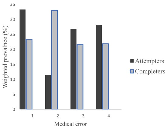 Weighted frequencies (% within each group) for each medical error category by group (attempters vs. completers). 1—Insufficient level of observation/lack of safety measures; 2—Inadequate suicide risk assessment; 3—Inadequate/delayed diagnostic assessment; 4—Inadequate treatment.