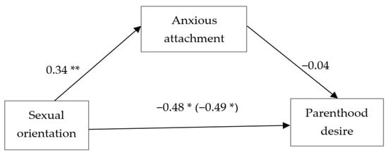 The mediation effect of anxious attachment on the association between sexual orientation and parenthood desire. Note. N = 789. The reported values are unstandardized regression coefficients (Bs) for the pathways between sexual orientation (0 = heterosexual, 1 = sexual minority), avoidant attachment, and parenthood desire. Gender, age, education, relationship status, and place of residence were used as covariates. The total effect of sexual orientation on parenthood desire is reported in parentheses. * p < 0.05. ** p < 0.01.