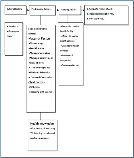In this current study, we chose the potential confounding factors based on a behavioral model for health services utilization, proposed by Andersen, and grouped the factors potentially associated with ANC []. The Andersen model has been broadly used to examine health service utilization factors [,,,]. Furthermore, the choice of potential confounding factors was informed by the available variables in the datasets of the NDHS-6. The independent variables were categorized into external, predisposing (socio-demographic and health knowledge), and enabling factors [,]. The underlying conceptual framework for this current study is presented in Figure 1.