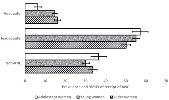 Prevalence and 95% confidence level of receipts of ANC by adolescent, young, and older women.