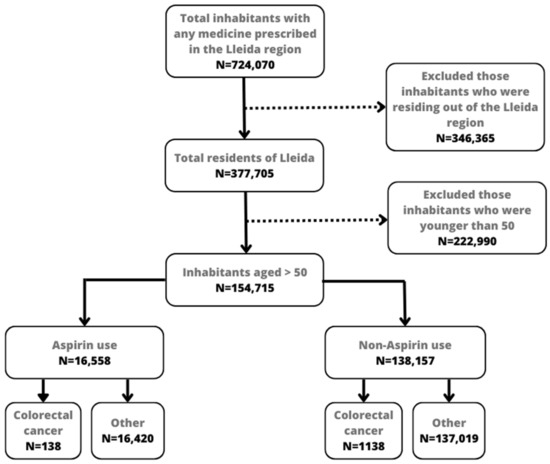 We conducted a retrospective cohort study of aspirin use and risk factors to analyze the impact of these factors on the risk of CRC. We carried out the study on 154,715 inhabitants of Lleida aged >50 years at the start of the study period, with data available on aspirin use from 1 January 2007 to 31 December 2016 in the Catalan Health Service (CatSalut) system. The reason for selecting this period was to ensure that those CRC cases detected in 2012 had the opportunity to be exposed to aspirin for at least five years. This population was linked to the Lleida Population-based Cancer Registry to detect CRC diagnosed between 2012 and 2016.