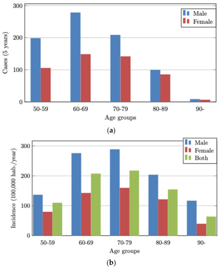 We analyzed 154,715 inhabitants of Lleida aged >50 years, of whom 1276 (0.8%) had CRC between 2012 and 2016. The mean CRC incidence rate and the total cases by sex and age group for the five study years are shown in Figure 2a,b.