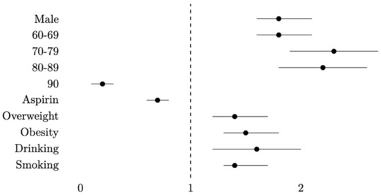 Table 4 shows the results of the Cox regression stratified by sex. In the case of males, the results were similar to the general table. In this model, aspirin exposure remained significant (aHR: 0.7; 95% CI: 0.6–0.8), as did the BMI, risky drinking and smoking. In females, aspirin use remained significant (aHR: 0.6; 95% CI: 0.4–0.8), but, of the risk factors, only obesity remained significant (aHR: 1.4; 95% CI: 1.2–1.9). Figure 4 represents the adjusted hazard ratios graphically.