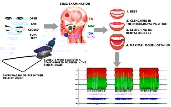 The surface electromyography (sEMG) study was performed using an 8-channel BioEMG III electromyograph (BioResearch Associates, Inc., Milwaukee, WI, USA). Four muscle pairs were analyzed: the anterior part of the TA; the superficial part of the MM; the middle part of the SCM; the anterior belly of the DA. The subjects assumed standardized positions in the dental chair—consistent with the previous methodology [5,6,7,8,21]. After cleansing the skin with ethyl alcohol, disposable Ag/AgCl electrodes (SORIMEX, Toruń, Poland) were applied, and a reference electrode was placed on the forehead. The sEMG test followed surface EMG for a non-invasive assessment of muscles (SENIAM) protocol [22].