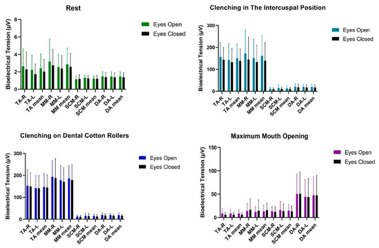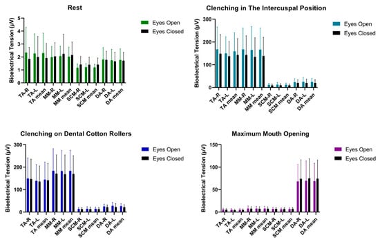 Graphical representation of bioelectrical activity of selected muscles of the masticatory and cervical spine muscles in women. TA—the anterior part of the temporalis muscle; MM—the superficial part of the masseter muscle; SCM—the middle part of the sternocleidomastoid muscle; DA—the anterior belly of the digastric muscle; R—right site; L—left site.