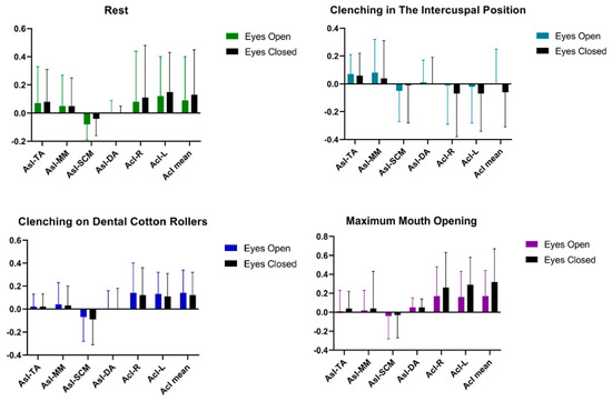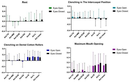Graphical representation of bioelectrical patterns of selected muscles of the masticatory and cervical spine muscles in women. AcI—Activity index; AsI—Asymmetry Index; TA—the anterior part of the temporalis muscle; MM—the superficial part of the masseter muscle; SCM—the middle part of the sternocleidomastoid muscle; DA—the anterior belly of the digastric muscle.