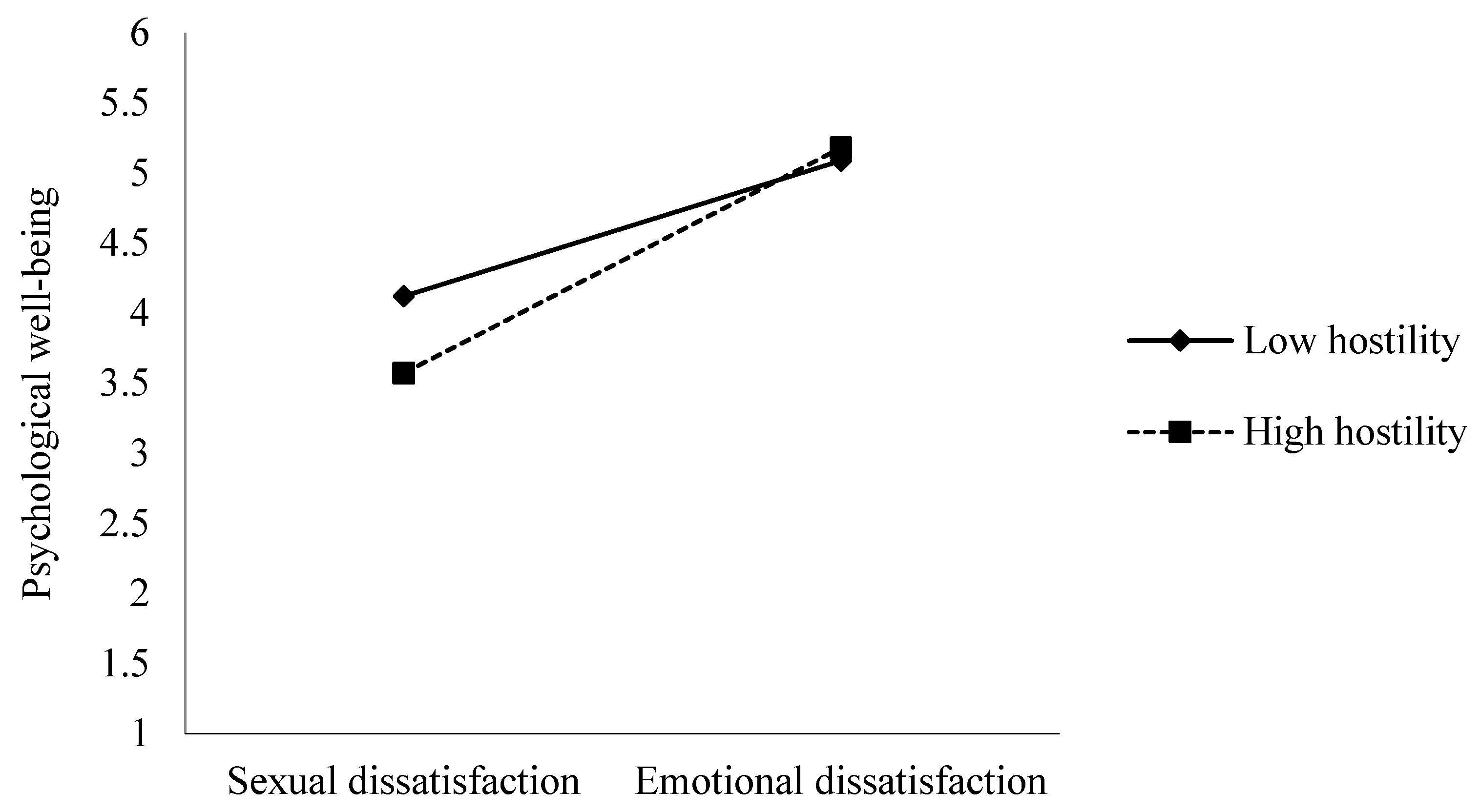 Regarding the relationship between negative affect and psychological well-being, several studies have shown that negative affect is negatively associated with well-being in both adults [] and youths and adolescents [,]. Especially in this last population, studies have found that the degree to which negative affect is associated with well-being seems to be linked to significant domains for adolescents (e.g., sexual skills and competencies) [,]. On a different note, studies have demonstrated that aggressiveness is associated with lower levels of well-being [,], although no empirical works have evidenced the relationship between hostility and psychological well-being, much less in the adolescent population. Instead, empirical evidence has supported that hostility negatively affects levels of physical well-being—an aspect that has been widely related to psychological well-being [,]—as a consequence of an individual’s negative interpersonal experiences [,]. Based on these arguments, we expected that high levels of negative affect (Hypothesis 2a) and high rates of hostility (Hypothesis 2b) would lead to lower levels of psychological well-being in the condition of infidelity due to sexual dissatisfaction.