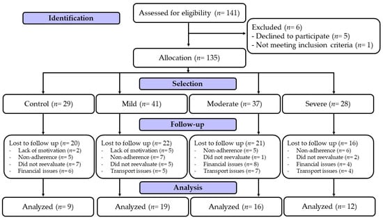 Participants were recruited via the Municipal Secretary of Health of Maringa and the Municipal Hospital of Maringa. Thus, 141 participants of both sexes were eligible for the study. It was accepted by people with the following characteristics: (i) male and female aged between 19 and 65 years old; (ii) present a positive diagnosis for COVID-19 by laboratory confirmation; (iii) having received the first dose of the COVID-19 vaccine; (iv) being overweight or obese according to the cut-off points established by the World Health Organization [12]; (v) having participated in at least 85% of the interventions [11]; (vi) participate in the pre-participation assessment; and (vii) have contracted COVID-19 between 3 January 2021 and 1 July 2021. As exclusion criteria, the following were not accepted: (i) patients with debilitating neurological diseases (i.e., Alzheimer’s, Parkinson’s disease, and plegies); (ii) reduction in intellectual capacity via completion of the cognitive failures questionnaire [13]; (iii) use of corticosteroids and/or having a chronic or acute disease that would contraindicate physical exercise; (iv) pregnancy; and (v) not signing the informed consent form. Information was obtained via screening performed in the study by Lemos et al. [8]. Preliminarily, the sample calculation was performed via G*Power software version 3.1, using an analysis of the variance of repeated measures. An effect size of F = 0.4 was estimated considering an α = 0.05 and a correlation between repeated measures of 0.5; a sample of 56 individuals was estimated for β = 80%. Considering a possible loss of follow-up, it was decided to recruit more than 140 participants. One hundred and forty-one participants were recruited, of whom five were excluded for declining to participate in the study and one for refusing to take an anamnesis. The participants were divided into four groups, considering the symptoms of COVID-19 or the control group, namely: control group (n = 29); mild, with no hospitalization (n = 41); moderate, with hospitalization, but without the necessity for oxygen support (n = 37); and severe, with hospitalization and the necessity for oxygen support, i.e., mechanical or non-mechanical oxygen supply (n = 28). There was a sample loss of 80 participants due to lack of time, lack of motivation, financial issues, and transport issues, and those participants did not carry out the assessments. Dropouts occurred between the sixth and eighth weeks of the intervention. Finally, 56 participants in the four experimental groups were evaluated before and after the intervention. The current study was approved by the local Ethics and Research Committee under 4,546,726 and registered in the Brazilian Clinical Trial Registration Platform (ReBEC) under registration: RBR-4mxg57b, in full compliance with the Declaration of Helsinki. Figure 1 shows the experimental design of the present study.