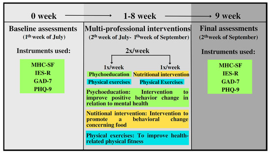 Participants went to the university laboratory for medical clearance, with the following measurements being taken: measurement of body weight and height (subsequent calculation of BMI [12]) and completing a detailed anamnesis to identify the clinical picture and symptoms of COVID-19. Subsequently, the study participants answered the applied questionnaires (see sections below). Participants self-completed the instruments before and after eight weeks of multi-professional interventions after all explanations about the instruments used.