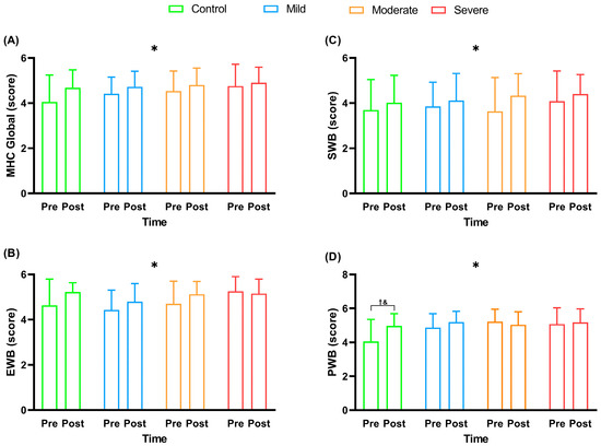 Mental Health Continuum (MHC) scores before and after multi-professional interventions. Data were described as mean and standard deviation (±); MHC = Mental Health Continuum; EWB = emotional well-being; SWB = social well-being; PWB = psychological well-being; * = timing effect (pre- vs. post-intervention); † = interaction between pre- and post-intervention for the control group (p < 0.05); & = interaction with significantly higher values for the control group when compared to the moderate group (p < 0.05); Panel (A) = MHC score Global; Panel (B) = EWB score; Panel (C) = SWB score; Panel (D) = PWB score.