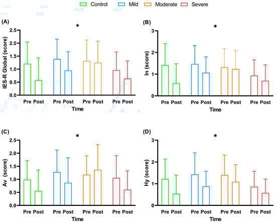 Impact event scale revised (IES-R) scores before and after multi-professional interventions. Data are presented as mean and standard deviation (±); IES-R = Impact Event Scale–Revised; In = intrusion; Av = avoidance; Hy = hyperarousal; * = timing effect (pre- and post-intervention) with p < 0.05; Panel (A) = IES-R global score; Panel (B) = In score; Panel (C) = Av score; Panel (D) = Hy score.