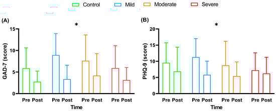Scores of (GAD-7) and (PHQ-9), before and after multi-professional interventions. Data are presented as mean and standard deviation (±); GAD-7 = 7-item Generalized Anxiety Disorder Questionnaire; PHQ-9 = Patient Health Questionnaire-9; * = timing effect (pre- and post-intervention), with p < 0.05; Panel (A) = GAD-7 score; Panel (B) = PHQ-9 score.