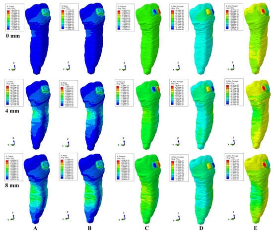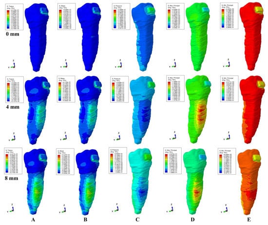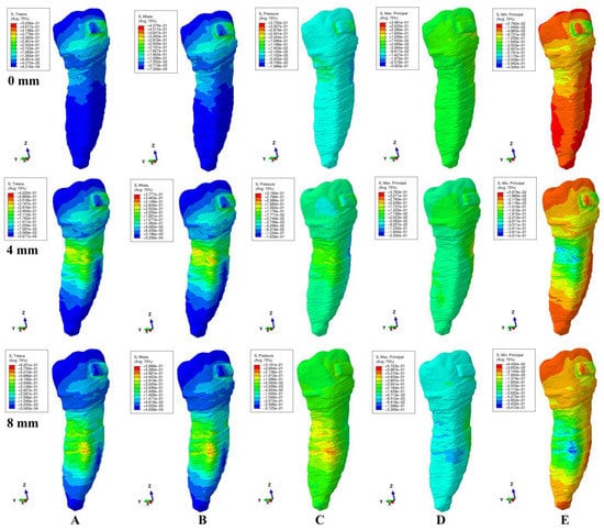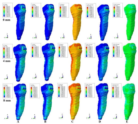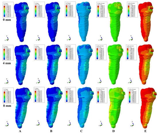 The qualitative (i.e., color-coded projection of stress distribution areas on the tooth surface) and quantitative (i.e., the amount of stress) results were assessed and displayed in