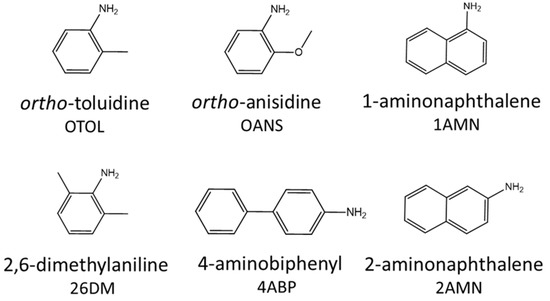 - Riffelmann, M.; Müller, G.; Schmieding, W.; Popp, W.; Norpoth, K. Biomonitoring of urinary aromatic amines and arylamine hemoglobin adducts in exposed workers and nonexposed control persons. Int. Arch. Occup. Environ. Health 1995, 68, 36–43. [Google Scholar] [CrossRef]