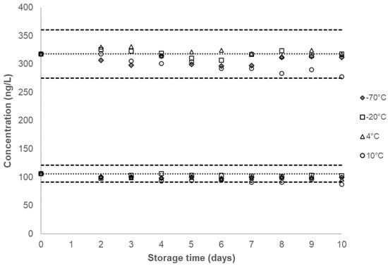 No marked decrease in concentration was observed for any of the analytes in either QC pool at −20 °C, 4 °C, 10 °C and −70 °C over a 10-day period (Figure 2, Supplemental Figures S1–S5). Our study showed a substantial decrease in the measured concentration in most analytes, for both QC pools stored at 20 °C, after two days (Figure 3, Supplemental Figures S11–S15). When stored at −70 °C, −20 °C, 4 °C, and 10 °C, the coefficients of variation (CVs) for all analytes in both QC pools are below 10%, with CVs for all analytes in the QC High recorded to be at or below 6% (Table 1).
