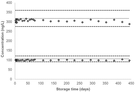 Over the duration of the characterization period or 19 months after the QC pools were prepared, no significant changes in concentration were observed for any analyte in either QC pool. For each analyte, the calculated concentrations from both QC pools were plotted after overlaying the corresponding mean analyte concentration along with the ±2σ interval (Figure 2, Figure 3 and Figure 4, Supplemental Figures S1–S15). Table 1 provides the QC characterization statistics and the summary statistics of each QC pool at the short-term and long-term storage conditions. The effect of repeated thaw (at approximately 20 °C) and re-freeze (at −70 °C) cycles on unprocessed urine samples and the effect of provisional storage of processed urine samples at −20 °C were determined for each analyte in a previous study [30]. The results indicated analyte stability following at least five thaw and re-freeze cycles and up to 13 weeks of storage stability of AAs in processed urine samples stored at −20 °C.