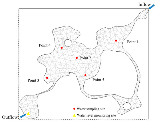 Water quality sampling points (including the inflow) and model grid of Xingqing Lake.