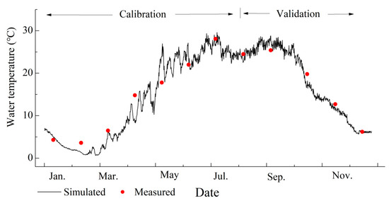 Through one-year data of the water level and water temperature, and after several adjustments to the model’s parameters, the values of the calibrated parameters of the hydrodynamic module were determined (Table 3). The results of the calibration and validation of the water temperature are shown in Figure 2 (the water level is not shown, as it is almost constant). During the calibration phase (January–July), the RMSEs between the simulated and measured data for the water level and water temperature were calculated to be 0.15 m and 1.76 °C, respectively. The corresponding NSE values were 0.87 and 0.89, respectively. The RMSEs for the water level and water temperature was 0.12 m and 1.37 °C, respectively, during the validation phase (August–December), and the NSEs were 0.88 and 0.91, respectively.