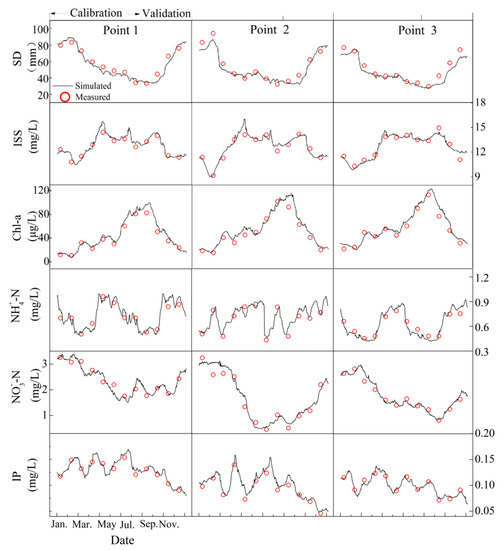 The RMSEs of the SD, ISS, Chl-a, NH4+-N, NO3−-N, and IP in the three points were calculated to be less than 7.31 mm, 2.04 mg/L, 7.12 μg/L, 0.08 mg/L, 0.30 mg/L, and 0.06 mg/L, respectively, during the calibration phase (January–July), and the corresponding NSEs were greater than 0.78, 0.82, 0.74, 0.76, 0.75, and 0.78, respectively. The RMSEs for SD, ISS, Chl-a, NH4+-N, NO3−-N, and IP were less than 7.61 mm, 2.36 mg/L, 6.45 μg/L, 0.10 mg/L, 0.25 mg/L, and 0.05 mg/L, respectively, during the validation phase (August to December), and their corresponding NSEs were 0.76, 0.80, 0.76, 0.74, 0.78, and 0.80, respectively. It can be seen from the results that the values of the NSEs are all higher than 0.74 (higher than 0.7 usually indicates that the calibration parameters of the model are reliable [39]); thus, the model calibrated in this case is valid and reliable for the simulation of the hydrodynamics, water quality, and transparency.