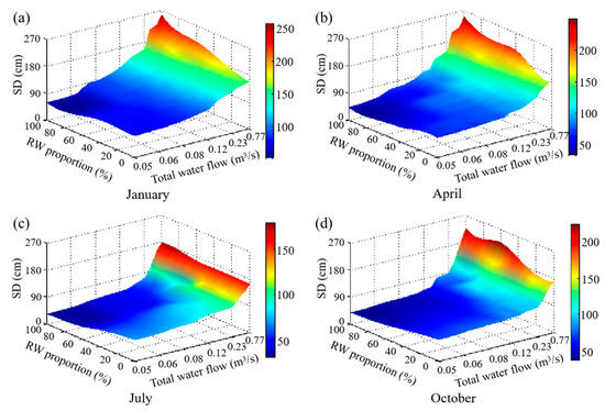 In general, in the spring and winter, when the temperature is low, the SD increases with the increase of the RW proportion. This is attributed to the fact that the algae growth is inhibited with the low temperature. The algae growth is less sensitive to the influence of the nutrient concentration and water inflow; thus, the SD is mainly related to the ISS concentration in the water body, and the higher the RW proportion, the lower the ISS concentration, so that the SD and RW proportion are positively correlated. However, in the summer and autumn, when temperatures are higher, there is no clear pattern. For example, in July, the total water flow is between 0.19 m3/s and 0.46 m3/s, and there are two peaks in the SD as the RW proportion increases at around 25% and 100% RW, respectively. When it is below 0.19 m3/s, the SD decreases while the RW proportion increases. The main reason for these results is that, under these conditions, algae growth is affected by a combination of factors such as nutrient concentration, nutrients, water flow velocity, and the diluting effect of water change in the water body [20,21,40].