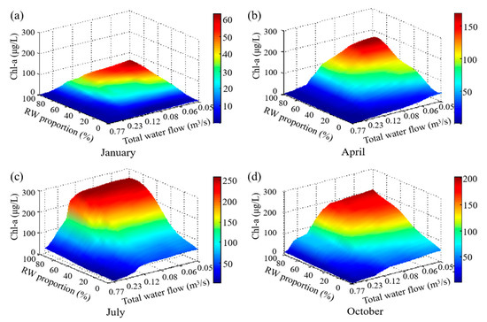 As can be seen from Figure 4, when the quality of the replenishing water is certain (RW proportion fixed), the SD decreases as the replenishment decreases, while Chl-a has an S-shaped curve increasing trend. The magnitude of both the decrease in SD and the increase in Chl-a are related to the total water flow. This is because, when the water quality is fixed, the ISS concentration is little related to the quantity of water replenished. Therefore, the SD is mainly related to the algae quantity. When the total water flow decreases, the hydrodynamic conditions of the lake are poor, and the dilution effect is also weakened, which would stimulate algae proliferation and also influence the water transparency. In July, for example, when the RW proportion was fixed at 40%, the total water flow decreased from 0.77 m3/s to 0.46 m3/s, and the SD fell gradually from 162.93 cm to 144.76 cm. This was due to the wash-out of algae from the lake before they were mature, causing a slow increase in algae from 8 μg/L to 26 μg/L (Figure 5). However, the total water flow decreased from 0.29 m3/s to 0.13 m3/s, and the SD decreased rapidly and markedly from 144.76 to 77.24 cm, as the hydraulic retention time was conducive to algal growth, and there was plenty of nutrient replenishment at this time, with Chl-a increasing rapidly from 35 μg/L to 112 μg/L (Figure 5). In contrast, when the total water flow decreased from 0.13 m3/s to 0.05 m3/s, the SD fluctuated within a narrow range (44.51–67.24 cm). This was due to the low level of water replenishment and lack of nutrient replenishment despite high nutrient concentrations in the inflow water source [8,20], resulting in a high but stable algal population (112–124 μg/L). Furthermore, the trends in SD and Chl-a were consistent with the percentage of RW in different seasons.
