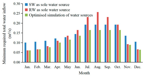 Taking the landscape water quality control target of SD ≥ 70 cm as an example for analysis, the corresponding minimum amount of the total water inflow required per month for Xingqing Lake under different water supply schemes is shown in Figure 6, which is according to the results of the model simulation after stabilization. As can be seen from the figure, in order to meet the landscape water quality requirements, as the sole source for water replenishment, the flow of the RW required is higher than that of the SW during the months of May to September, while, for rest of the year, the opposite is true. This is mainly due to the high temperatures in May–September, which are suitable for algae growth, and coupled with the high concentrations of nitrogen and phosphorus in the RW, the algae growth is faster, resulting in low SD [6,17]. Thus, there is a need to increase the amount of water replenishment and use the washing and dilution of water bodies to reduce the concentration of algae to meet the requirements of the landscape water quality. However, the temperature is comparatively lower in October–April, and the algae growth is inhibited, even if the nutrient concentrations are high in the RW replenishment. At this time, the SD is mainly affected by the ISS. Thus, it is conducive to the improvement of the SD with a higher proportion of the RW with the characteristics of low SS. This also means that it can be replenished with less water flow to meet the SD control criteria. Overall, it also suggests that a low ISS of the RW can compensate to an extent for the impact of algae growth on the SD caused by its high concentration of nutrients.
