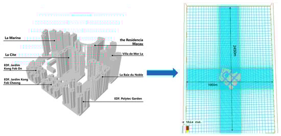 - Calculation area configuration: moderately adjust the grid density distribution according to the distance from the building complex itself and determine the sizes of the X, Y, and Z axes, which are 490, 1960, and 300, respectively.