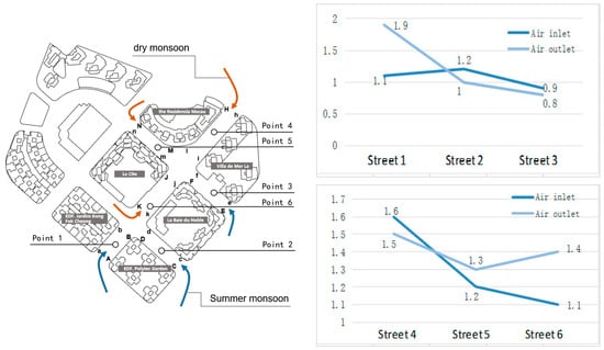 Location of incident flow wind distribution of measuring points and streets (blue is summer monsoon, red is winter monsoon); the change ratio of wind speed in each street during the summer monsoon (street 1 to 3) and winter monsoon (street 4 to 6).