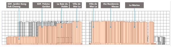 The building frontal area ratio reflects the dimensions of urban spatial form’s influence on air circulation. Using the north–south prevailing wind direction of the high-rise buildings in Areia Preta as a reference, Villa de Mer, the Residencia Macau, and La Marina comprise the first row of windward structures positioned in the north prevailing wind. Figure 6 shows that the first row of buildings facing the south wind are EDF. Polytec Garden, EDF. Jardim Kong Fok Cheong, EDF. Jardim Kong Fok On, La Baie du Noble, and Villa de Mer.