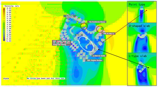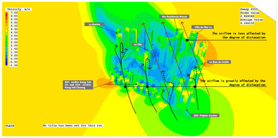 The degree of building arrangement is expressed by the index of strewnness, which indicates the floating level of height difference in the building group and the varying levels of buildings on the plot in the vertical space. In the study, the average level of displacement in each residential neighborhood and all high-rise buildings in Areia Preta was determined. The average height of buildings in the high-rise residential neighborhood of Areia Preta is 118.75 m, with La Marina, the Residencia Macau, Villa de Mer, and La Cite having a staggered degree of +30.25 m. La Baie du Noble is +19.25 m, EDF. Polytec Garden is +1.25 m, and EDF. Jardim Kong Fok Cheong and EDF. Jardim Kong Fok On are −70.75 m. The summertime due south wind field environment is chosen as the research reference (Figure 7). When the staggered degree is low, the building height level is lower and at the same height, and the skimming airflow can continue to flow in the original wind direction. When the impact of the degree of randomness is greater and the height of the building is considerable, as the height of the local building increases, the local wind speed at the corner of the building increases, and the airflow flows along the sides of the building. The more staggered the buildings, the higher the wind speed near the ground, the slower the flying airflow, and the better the shielding function of the building complex.